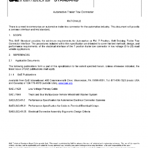 This SAE Standard provides the minimum requirements for Automotive or RV, 7 Position, Self Draining Trailer Tow Connector Interface. The procedures included within this specification are intended to cover the test methods, design, and performance requirements, of the electrical interface of the 7 position trailer tow connector in low voltage (0 to 20) road vehicle applications.