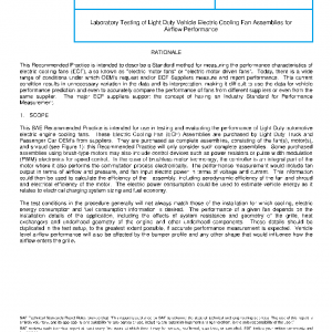 This SAE Recommended Practice is intended for use in testing and evaluating the performance of Light Duty automotive electric engine cooling fans. These Electric Cooling Fan (ECF) Assemblies are purchased by Light Duty Truck and Passenger Car OEM’s from suppliers. They are purchased as complete assemblies, consisting of the fan(s), motor(s), and shroud (see Figure 1); this Recommended Practice will only consider such complete assemblies. Some purchased assemblies using brush-type motors may also include control devices such as power resistors or pulse width modulation (PWM) electronics for speed control. In the case of brushless motor technology, the controller is an integral part of the motor where it also performs the commutation process electronically. The performance measurement would include fan output in terms of airflow and pressure, and fan input electric power in terms of voltage and current. This information could then be used to calculate the efficiency of the assembly, including aerodynamic efficiency of the fan and shroud and electrical efficiency of the motor. The electric power consumption could be used to estimate vehicle energy as it relates to electrical charging system sizing and fuel economy.