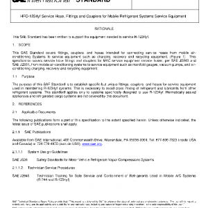 This SAE Standard covers fittings, couplers, and hoses intended for connecting service hoses from mobile air-conditioning Systems to service equipment such as charging, recovery and recycling equipment. (Figure 1) This specification covers service hose fittings and couplers for MAC service equipment service hoses, per SAE J2843 and SAE J2851, from mobile air-conditioning systems to service equipment such as manifold gauges, vacuum pumps, and air-conditioning charging, recovery and recycling equipment.
