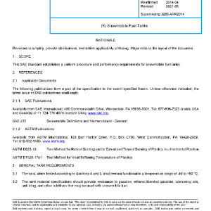 This SAE Standard establishes a uniform procedure and performance requirements for snowmobile fuel tanks.