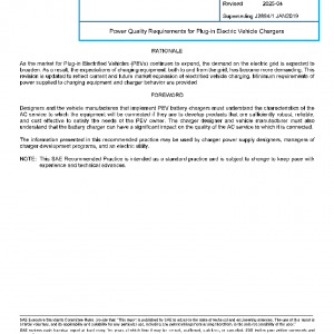 The intent of this document is to develop a recommended practice for PEV chargers, whether onboard or off-board the vehicle, that will enable equipment manufacturers, vehicle manufacturers, electric utilities, and others to make reasonable design decisions regarding power quality. The three main purposes are as follows: