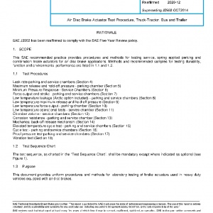 This SAE recommended practice provides procedures and methods for testing service, spring applied parking and combination brake actuators for air disc brake applications. Methods and recommended samples for testing durability, function and environmental performance are listed in 1.1 and 1.2.
