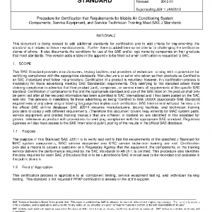 This SAE Standard provides manufacturers, testing facilities and providers of technician training with a procedure for certifying compliance with the appropriate standards. Manufacturers or seller who advertise their products as Certified to an SAE J standard shall follow this procedure. Certification of a product is voluntary; however, this certification process is mandatory for those advertising meeting SAE Standard(s) requirements. Only certifying to this standard allows those claiming compliance to advertise that their product (unit), component, or service meets all requirements of the specific SAE standard. Certification of compliance to this and the appropriate standard and use of the SAE label on the product shall only be permitted after all the required information has been submitted to SAE International and it has been posted on the SAE web site. This process is mandatory for those advertising as being “Certified to SAE JXXXX [appropriate SAE Standard] requirements or any advertising or labeling language that implies such certification. SAE International will post the results in the official SAE on-line database. SAE J2911 requires manufacturers, testing facilities, and technician training providers to comply with different requirements. (Therefore this document covers requirements for MAC system parts, service equipment and printed training manuals that are different in content so are identified in this standard for general reference as product with procedures for certifying compliance with the appropriate SAE standard. Regulatory agencies will also have access to the SAE International public posting of the results in the official SAE database.