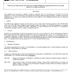 This SAE Standard applies to refrigerant identification equipment to be used for identifying refrigerant HFC-134a (R-134a) and/or HFO-1234yf (R-1234yf) refrigerant when servicing a mobile A/C system or for identifying refrigerant in a container to be used to charge a mobile A/C system. Identification or other refrigerants are the option of the equipment manufacturer, although it shall not misidentify refrigerants, per 3.2.