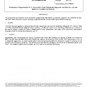 This SAE Standard applies to refrigerant identification equipment to be used for identifying refrigerant HFC-134a (R-134a) and HFO-1234yf (R-1234yf) refrigerant when servicing a mobile A/C system or for identifying refrigerant in a container to be used to charge a mobile A/C system. Identification of other refrigerants is the option of the equipment manufacturer, although it shall not misidentify refrigerants, per 3.2.