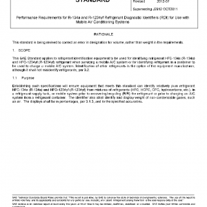 This SAE Standard applies to refrigerant identification equipment to be used for identifying refrigerant HFC-134a (R-134a) and HFO-1234yf (R-1234yf) refrigerant when servicing a mobile A/C system or for identifying refrigerant in a container to be used to charge a mobile A/C system. Identification of other refrigerants is the option of the equipment manufacturer, although it shall not misidentify refrigerants, per 3.2.