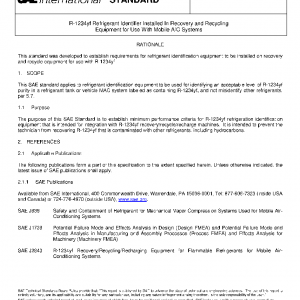 This SAE standard applies to refrigerant identification equipment to be used for identifying an acceptable level of R-1234yf purity in a refrigerant tank or vehicle MAC system labeled as containing R-1234yf, and not misidentify other refrigerants, per 5.7.