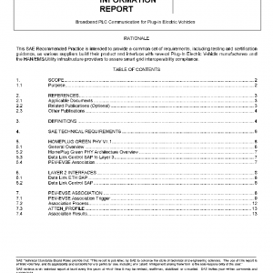 This SAE Technical Information Report SAE J2931/4 establishes the specifications for physical and data-link layer communications using broadband Power Line Communications (PLC) between the Plug-In Vehicle (PEV) and the Electric Vehicle Supply Equipment (EVSE) DC off-board-charger. This document deals with the specific modifications or selection of optional features in HomePlug Green PHY v1.1 necessary to support the automotive charging application over Control Pilot lines as described in SAE J1772™. PLC may also be used to connect directly to the Utility smart meter or Home Area Network (HAN), and may technically be applied to the AC mains, both of which are outside the scope of this document.