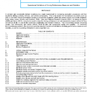 This Recommended Practice, Operational Definitions of Driving Performance Measures and Statistics, provides functional definitions of and guidance for performance measures and statistics concerned with driving on roadways. As a consequence, measurements and statistics will be calculated and reported in a consistent manner in SAE and ISO standards, journal articles proceedings papers, technical reports, and presentations so that the procedures and results can be more readily compared. Only measures and statistics pertaining to driver/vehicle responses that affect the lateral and longitudinal positioning of a road vehicle are currently provided in this document. Measures and statistics covering other aspects of driving performance may be included in future editions. For eye glance-related measures and statistics, see SAE J2396 (Society of Automotive Engineers, 2007) and ISO 15007-1 (International Standards Organization, 2002).