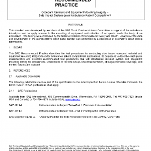 This SAE Recommended Practice describes the test procedures for conducting side impact occupant restraint and equipment mounting integrity tests for ambulance patient compartment applications. Its purpose is to describe crash pulse characteristics and establish recommended test procedures that will standardize restraint system and equipment mounting testing for ambulances. Descriptions of the test set-up, test instrumentation, photographic/video coverage, and the test fixtures are included.