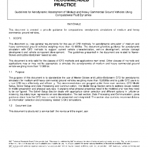 This document outlines general requirements for the use of CFD methods for aerodynamic simulation of medium and heavy commercial ground vehicles weighing more than 10 000lbs. The document provides guidance for aerodynamic simulation with CFD methods to support current vehicle characterization, vehicle development, vehicle concept development and vehicle component development. The guidelines presented in the document are related to Navier-Stokes and Lattice-Boltzmann based solvers.