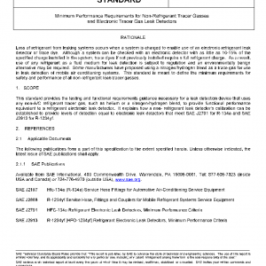 This standard provides the testing and functional requirements guidance necessary for a leak detection device that uses any non-A/C refrigerant tracer gas, such as helium or a nitrogen-hydrogen blend, to provide functional performance equivalent to a refrigerant electronic leak detector. It explains how a non- refrigerant leak detector’s calibration can be established to provide levels of detection equal to electronic leak detectors that meet SAE J2791 for R-134a and SAE J2913 for R-1234yf.