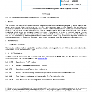 This recommended practice is intended to provide industry technical personnel with an overview of vehicle speedometer system accuracy and offset requirements and odometer system accuracy requirements. Speedometer and odometer systems covered by this document are integrated into a vehicle’s electrical and electronics system, assembled directly into the vehicle by the OEM, and use rotational data from at least one vehicle wheel that is appropriately converted into longitudinal vehicle speed and distance traveled information. This standard is limited to radial ply tires on new (as manufactured) cars, light trucks, and medium duty trucks. Other methods for measuring vehicle speed and distance traveled may be used provided they meet the performance recommendations herein. Any local market regulatory requirements must be met and shall supersede this document. Service parts are beyond the scope of this recommended practice.