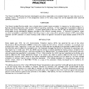 This SAE Recommended Practice incorporates dynamometer test procedures that produce riding range estimates for electric motorcycles during stop-and-go urban riding on surface streets and commuting trips in urban areas that include operation on freeways.