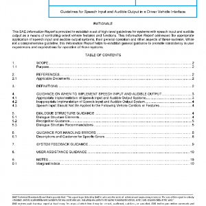 The scope of this document is a technology-neutral approach to speech input and audible output system guidelines applicable for OEM and aftermarket systems in light vehicles. These may be stand-alone interfaces or the speech aspects of multi-modal interfaces. This document does not apply to speech input and audible output systems used to interact with automation or automated driving systems in vehicles that are equipped with such systems while they are in use (ref. J3016:JAN2014).