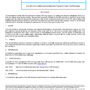 This test procedure outlines the necessary test equipment (test fixture, dynamometer, data acquisition system, etc.) and test sequence required to test for low-frequency brake noise (200 Hz to 1.25 kHz) on a brake noise dynamometer. It is intended to complement SAE J2521, which focuses on high-frequency brake squeal. This RP applies to passenger cars and light trucks with a gross vehicle weight rating below 4536 kg. Before using this RP for heavier vehicles, consult and agree with the test requestor and the testing facility.