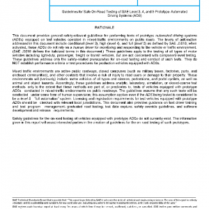 This document provides guidelines for the safe conduct of on-road tests of vehicles equipped with prototype conditional, high, and full (levels 3-5) automated driving systems (ADSs), as defined by SAE J3016. It does not include guidance for testing production ADSs intended for sale to the general public. The scope is further limited to testing of automated prototype vehicles on public roads.
