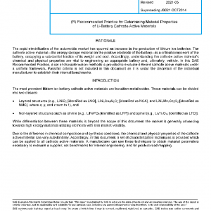 This SAE Recommended Practice provides a set of test methods and practices for the characterization of lithium ion battery cathode active material.