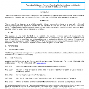 The purpose of this SAE Standard is to establish the specific minimum equipment requirements for recovery/recycling/recharge equipment intended for use with both R-1234yf and R-134a in a common refrigerant circuit that has been directly removed from, and is intended for reuse in, mobile air-conditioning (A/C) systems. This document does not apply to equipment used for R-1234yf and R-134a having a common enclosure with separate circuits for each refrigerant, although some amount of separate circuitry for each refrigerant could be used.