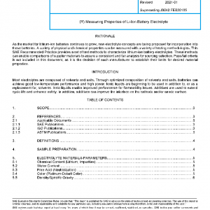 This SAE Recommended Practice provides a set of test methods for characterizing lithium-ion battery electrolytes. These test methods are applicable to existing electrolyte materials and allow different facilities to conduct testing in a common manner.
