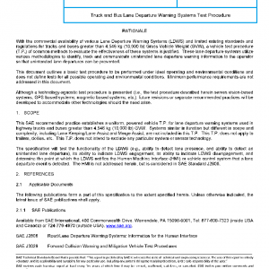 This SAE recommended practice establishes a uniform, powered vehicle T.P. for lane departure warning systems used in highway trucks and buses greater than 4,546 kg (10,000 lb) GVW. Systems similar in function but different in scope and complexity, including Lane Keeping/Lane Assist and Merge Assist, are not included in this T.P. This T.P. does not apply to trailers, dollies, etc. This T.P. does not intend to exclude any particular system or sensor technology.
