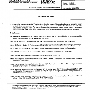 The purpose of this SAE Standard is to describe test conditions and performance evaluation factors for both diesel and gasoline engine tests. Specifically, the tests described in this document are used in the requirements for engine oils in U.S. military specifications, as well as in the API Engine Service Classification system described in API Publication 1509, and the ASTM D 4485, SAE J183, and SAE J1423 standards.