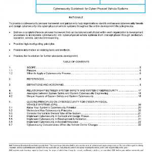 This recommended practice provides guidance on vehicle Cybersecurity and was created based off of, and expanded on from, existing practices which are being implemented or reported in industry, government and conference papers. The best practices are intended to be flexible, pragmatic, and adaptable in their further application to the vehicle industry as well as to other cyber-physical vehicle systems (e.g., commercial and military vehicles, trucks, busses). Other proprietary Cybersecurity development processes and standards may have been established to support a specific manufacturer’s development processes, and may not be comprehensively represented in this document, however, information contained in this document may help refine existing in-house processes, methods, etc.