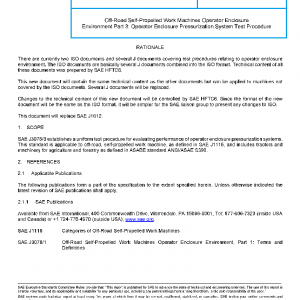 SAE J3078/3 establishes a uniform test procedure for evaluating performance of operator enclosure pressurization systems. This standard is applicable to off-road, self-propelled work machine, as defined in SAE J1116, and includes tractors and machinery for agriculture and forestry as defined in ASABE standard ANSI/ASAE S390.