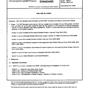 This SAE Standard covers fuel and oil hose, coupled and uncoupled, for use with gasoline, oil, diesel fuel, lubrication oil, or the vapor present in either the fuel system or in the crankcase of internal combustion engines in mobile, stationary, and marine applications. Section 7 covers hose primarily intended to meet the demands of fuel injection systems.