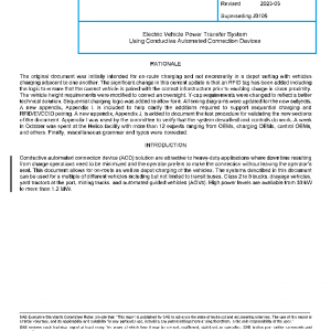 This document covers the general physical, electrical, functional, testing, and performance requirements for conductive power transfer, primarily for vehicles using a conductive ACD connection capable of transferring DC power. It defines conductive power transfer methods, including the infrastructure electrical contact interface, the vehicle connection interface, the electrical characteristics of the DC supply, and the communication system. It also covers the functional and dimensional requirements for the vehicle connection interface and supply equipment interface. New editions of the documents shall be backwards compatible with the older editions. There are also sub-documents which are identified by a SAE J3105/1, SAE J3105/2, and SAE J3105/3. These will be specific requirements for a specific interface defined in the sub-document.