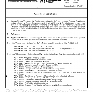 This SAE Recommended Practice was developed by SAE, and the section “Standard Classification and Specification for Service Greases” cooperatively with ASTM, and NLGI. It is intended to assist those concerned with the design of automotive components, and with the selection and marketing of greases for the lubrication of certain of those components on passenger cars, trucks, and buses. The information contained herein will be helpful in understanding the terms related to properties, designations, and service applications of automotive greases.