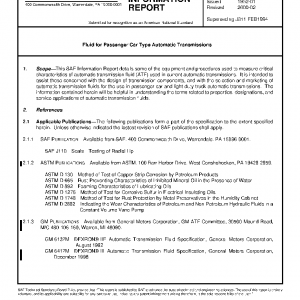 This SAE Information Report details some of the equipment and procedures used to measure critical characteristics of automatic transmission fluid (ATF) used in current automatic transmissions. It is intended to assist those concerned with the design of transmission components, and with the selection and marketing of automatic transmission fluids for the use in passenger car and light-duty truck automatic transmissions. The information contained herein will be helpful in understanding the terms related to properties, designations, and service applications of automatic transmission fluids.