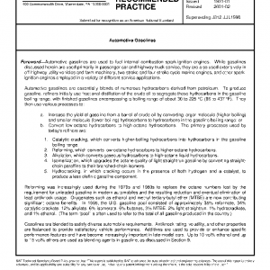This SAE Recommended Practice summarizes the composition of modern automotive gasolines, the significance of their physical and chemical characteristics, and the pertinent test methods for defining or evaluating these properties.