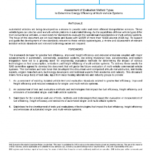 This document provides an assessment of current engineering test and simulation standards and methods used to determine the fuel efficiency, freight efficiency and emissions of single-vehicle systems comprised primarily of on-road trucks and buses with GVWR of more than 10000 pounds (4535 kg). This document provides guidance on the applicability and use of each test and simulation standard, method and technology discussed for multi-vehicle systems.