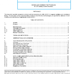 This document provides vehicle-level data collection, data analysis, and data verification procedures that may be used to verify that an instrument under test (IUT) satisfies the vehicle-level requirements specified in SAE J3161/1. For the purposes of this report, “vehicle-level requirements” primarily consist of those requirements which can be verified external to the vehicle. The IUT for these procedures is a configured LTE-V2X vehicle-to-vehicle (V2V) device as defined in SAE J3161/1 and is installed on a light vehicle1 or public safety vehicle2. While the IUT is conceptually separated from the vehicle it is installed on, the tests outlined in this document are primarily vehicle-level so the terms “vehicle” and “IUT” can generally be considered interchangeable. Additionally, non-vehicle-level complimentary tests, not included in this document, are required to verify that the entire set of requirements specified in SAE J3161/1 is satisfied.