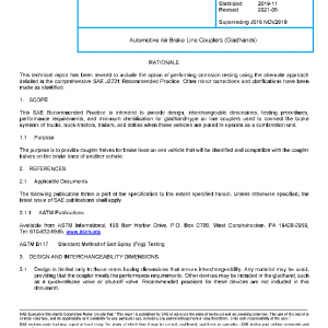 This SAE Recommended Practice is intended to provide design, interchangeable dimensions, testing procedures, performance requirements, and minimum identification for gladhand-type air line couplers used to connect the brake systems of trucks, truck-tractors, trailers, and dollies when these vehicles are joined to operate as a combination unit.