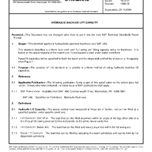 This standard describes a uniform “over end” and “full swing arc” lifting capacity rating for backhoes. It is based on the actual capacity of the machine to lift and support a load under stable conditions.