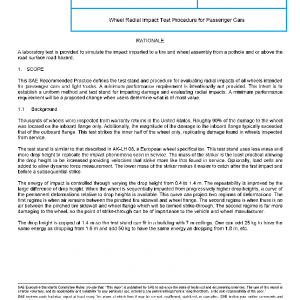 This SAE Recommended Practice defines the test stand and procedure for evaluating radial impacts of all wheels intended for passenger cars and light trucks. A minimum performance requirement is intentionally not provided. The intent is to establish a uniform method and test stand for imparting damage and evaluating radial impacts. A minimum performance requirement will be a proposed change when users determine what is of most value.