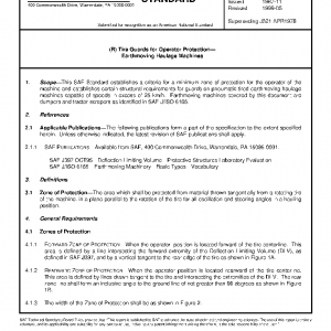 This SAE Standard establishes a criteria for a minimum zone of protection for the operator of the machine and establishes certain structural requirements for guards on pneumatic-tired earthmoving haulage machines capable of speeds in excess of 25 km/h. Earthmoving machines covered by this document are dumpers and tractor-scrapers as identified in SAE J/ISO 6165.