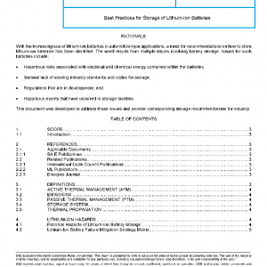 This document aids in mitigating risk for the storage of lithium-ion cells, traction batteries, and battery systems intended for use in automotive-type propulsion systems and similar large format (e.g., stationary, industrial) applications. Nothing precludes other industries and applications from using these recommendations.
