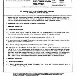 This SAE Recommended Practice is applicable for determining the cold characteristics of vinyl-coated fabrics and other automotive plastic materials, as applicable. It consists of three different methods for determining low-temperature properties of materials depending on type of material and end use.