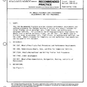 This SAE Recommended Practice provides minimum performance requirements and uniform procedures for fatigue testing of ferrous disc wheels intended for normal highway use on passenger cars, light trucks, and multipurpose passenger vehicles. For procedures and minimum performance requirements for wheels used on medium and heavy trucks, see SAE J267. For wheels used on trailers drawn by passenger cars, light trucks, or multipurpose vehicles, see SAE J1204. Wheels intended for temporary use and nonferrous road wheels are not included in this document.