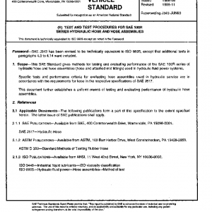 This SAE Standard gives methods for testing and evaluating performance of the SAE 100R series of hydraulic hose and hose assemblies (hose and attached end fittings) used in hydraulic fluid power systems.