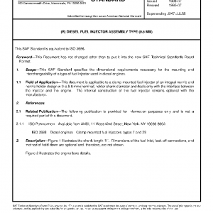 This SAE Standard specifies the dimensional requirements necessary for the mounting and interchangeability of a type of fuel injector used in diesel engines.