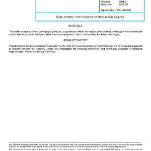 This SAE Recommended Practice establishes equipment and procedures for testing spark arresters used on medium-size, single-position internal combustion engines, normally used in transportable, stationary, and vehicular applications, such as highway trucks, agricultural tractors, industrial tractors, other mobile equipment, and motorcycles. This document provides two methods of testing (laboratory testing and engine testing) which may be used to evaluate a spark arrester. It also includes special requirements for screen type devices and an endurance test procedure for screen type spark arresters.