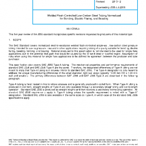 The SAE Standard covers normalized electric-resistance welded flash-controlled single-wall, low-carbon steel pressure tubing intended for use as pressure lines and in other applications requiring tubing of a quality suitable for bending, double flaring, beading, forming, and brazing. Material produced to this specification is not intended to be used for single flare applications due to the potential leak path that would be caused by the ID weld bead or scarfed region. Assumption of risks when using this material for single flare applications to be defined by agreement between the producer and tube purchaser.