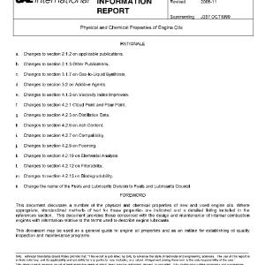 This SAE Information Report reviews the various physical and chemical properties of engine oils and provides references to test methods and standards used to measure these properties. It also includes general references on the subject of engine oils, base stocks, and additives.