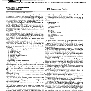The recommended practice applies to the dynamometer test procedure which can be used to assess the smoke emission characteristics of vehicular diesel engines. In particular, these procedures describe the smoke emissions test, smoke test cycle, equipment and instrumentation, instrument checks, and chart reading and calculation, for evaluation of an engine’s steady-state and transient smoke emission characteristics.