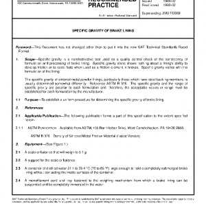 Specific gravity is a nondestructive test used as a quality control check of the consistency of formulation and processing of brake lining. Specific gravity alone shows nothing about a lining’s ability to develop friction or to resist fade when used as a friction element in brakes. Specific gravity varies with the formulation of the lining.