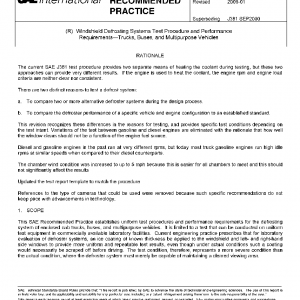 This SAE Recommended Practice establishes uniform test procedures and performance requirements for the defrosting system of enclosed cab trucks, buses, and multipurpose vehicles. It is limited to a test that can be conducted on uniform test equipment in commercially available laboratory facilities. Current engineering practice prescribes that for laboratory evaluation of defroster systems, an ice coating of known thickness be applied to the windshield and left- and right-hand side windows to provide more uniform and repeatable test results, even though under actual conditions such a coating would necessarily be scraped off before driving. The test condition, therefore, represents a more severe condition than the actual condition, where the defroster system must merely be capable of maintaining a cleared viewing area.